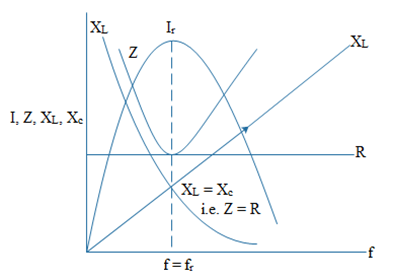 The above graph shows the relation between I, XL, Xc, Z with respect to frequency of AC source. When f = fo or fr, ‘I’ is maximum known as resonant current.