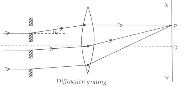An arrangement consisting a large number of equidistant, parallel, rectangular slits of equal width separated by opaque space is called diffraction grating. It is made by ruling equidistant parallel lines on an optically transparent plate. The ruled lines act as opaque to light. If a and b are the width of transparent and opaque part of the grating, then, (a + b) = d, is called ‘grating element’. If ‘N’ be the number of ruling lines per unit length, then (a + b) = 1/N.