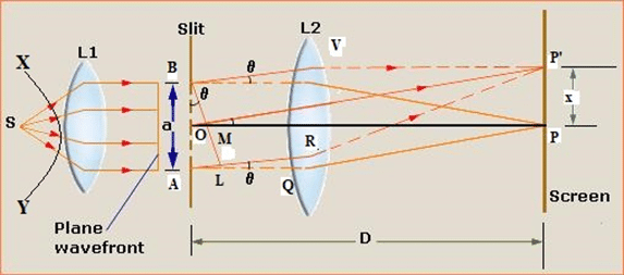 Let us consider a narrow-slit AB of width β€˜d’ is illuminated by monochromatic light source (S). The spherical wavefront XY originating from ‘S’ is made ‘a plane wavefront’ by the lens L1. The plane wavefront passes through the slit AB and is incident on the lens L2. The waves in the direction of OP come to focus at P, which is the position of central maximum.
