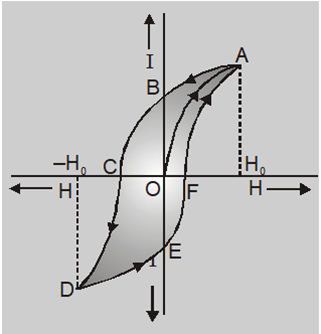 Now H is increased in reverse direction to make I or B zero. I or B now decreases along BC and becomes zero at C. The value of reverse magnetizing field required to reduce residual magnetism to zero is called coercivity of the material, measured by OC of curve. When H is further increased I or B increases along CD. At D, material acquires state of magnetic saturation. (D is symmetrical to point A). Here, magnetizing field H becomes zero before I or B. The intensity of magnetization I or B always lags behind H. This is called hysteresis. The area of hysteresis loop is a measure of energy dissipated per cycle per unit volume of the specimen and depends on nature of material. The slope of I-H curve give susceptibility.