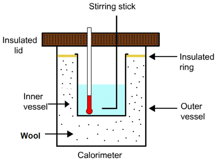 The vessel in which heat exchange in between different bodies at different temperature is observed is called calorimeter. It is made of copper with copper stirrer kept inside a wooden box having lid. A thermometer can be inserted from the hole on the liq. A woollen cloth is kept into the gap between vessel and wooden box.