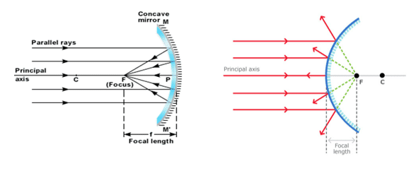 - Focus (F): The focus of the spherical mirror is the point on the principal axis at which the incident rays parallel to the principal axis actually meet or appears to meet after reflection. For concave mirror, the incident rays parallel to the principal axis actually meet at the focus & in case of convex mirror, the incident rays parallel to the principal axis don’t actually meet but they appear to be coming from the focus after reflection.