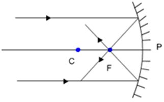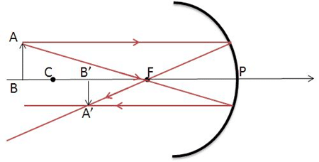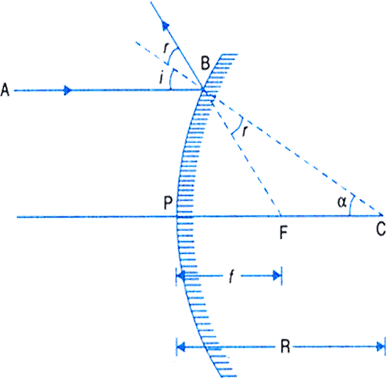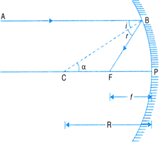 Let us consider, a concave mirror having focal length f and radius of curvature (R). Let, a ray of light AB parallel to the principal axis incident at B & after reflection, it passes through the focus (F). Let, C & P be the centre of curvature & the pole of the mirror.
