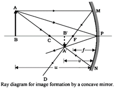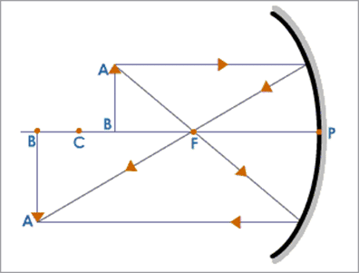 Let us consider, a concave mirror of focal length f and radius of curvature R. Let, an object AB is placed in front of a concave mirror. The rays of light AM parallel to the principal axis incident at M, after reflection, passes through focus (F). Another ray AP, after reflection passes through PA‘ & finally the ray AC passes through centre of curvature and retraces its path. These rays intersect at a point A‘, where a real, inverted image A‘B‘ of the object is formed.