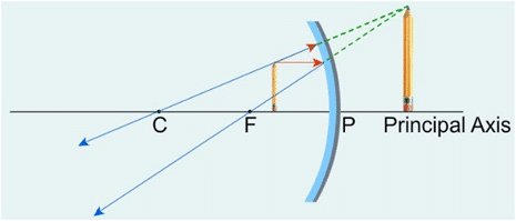 The image is formed on the other side of the mirror, when the object is placed between focus (F) and pole (P). In the ray diagram, we can see that, the reflected rays do not meet at a point but it seems to appear from the opposite side of the mirror. So,