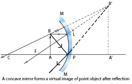 Let, MN be the small aperture of concave mirror. An object AB is held perpendicular to the principal axis of the mirror between the focus and pole (P) as shown in figure. A virtual image (erect & magnified) of the object is formed as shown in figure. From figure,