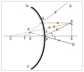 Let, MN be the small aperture of mirror. A ray of light from an object AG parallel to principal axis incident at point G and reflected along GQ. Another ray of light AP is reflected along PD. Third ray AE is reflected back. When these rays are produced back, they are intersecting at a point A’, where, a virtual, erect and diminished image (A’B’) is formed.
