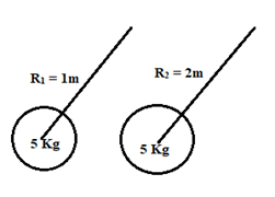 Here, in the figure, both masses are same. i.e. 5kg. But, r1 = 1m and r2 = 2 m. So, rotation will be easier in rl = 1m.