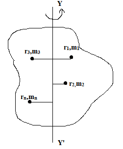 Let us consider, a rigid body where YY’ be the axis of rotation as shown in figure. m1 = m2 = …………. mn be the masses of different particles of rigid body at the distance r1, r2, …. rn from the axis of rotation.