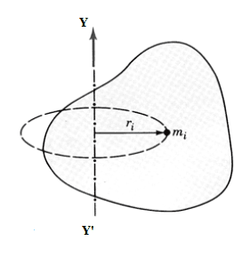 Let us consider, a rigid body where YY’ be the axis of rotation as shown in figure. m1, mand mn be the masses of different particles of rigid body at the distance r1, r2, …….. r2 from axis of rotation. We know that,
