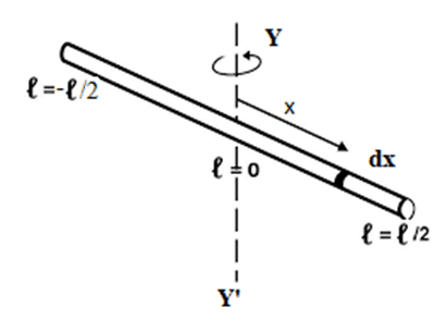Let us consider, a thin uniform rod of length ‘l’ and mass ‘M’, YY’ be the axis of rotation from the centre of rod as shown in figure.