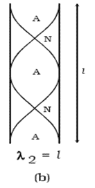 In this mode of vibration, there are 2 nodes and 2 antinodes. If [latex]\lambda_2[/latex] is the wavelength of the wave, then,