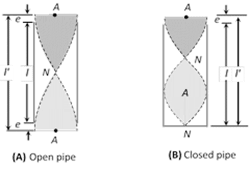 In the derivation of harmonics of organ pipe, it is supposed that the antinode of stationary wave is exactly at the open end of the pipe. But, in practice, the antinode is formed a little away from the open end. The small extra distance between open end of the pipe and the point where the antinode is actually formed is called end correction (e or x). The effective length of the vibrating air column, therefore is slightly greater than actual length of the pipe. From theoretical consideration, Rayleigh determined it as [latex]0.3\Delta[/latex], where, [latex]\Delta[/latex] is the internal diameter of pipe.