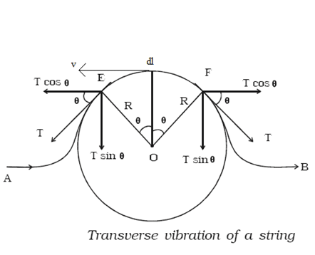 Let us take a single symmetrical pulse moving from left to right with speed, v. βdlβ be the length of the small segment of mass βdmβ of the pulse, that forms an arc of a circle of radius βRβ which subtends an angle 2ΞΈ at the centre O. Let us analyse the particle from the reference of frame of wave. This means βdlβ appears to move back with velocity v.