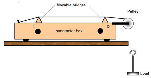 Sonometer is used to verify the laws of transverse vibration of string experimentally. The experimental arrangement is shown in figure below.