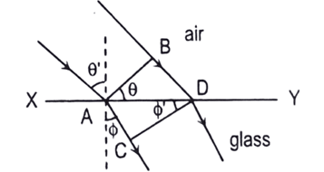 2. [2080 β€˜R’] The given figure represents a wavefront AB moving in air and incident on a plane glass surface XY. Its position after refraction through the glass slab is CD. The refractive index of glass with respect to air will be equal to: