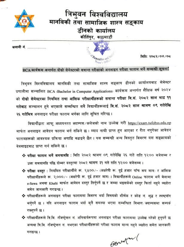 Tribhuvan University – Faculty of Humanities and Social Sciences – Dean’s Office, Kirtipur, Kathmandu has officially published the exam form fill-up notice for the Bachelor in Computer Applications (BCA) Second Semester.